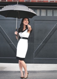 Puoi scegliere un bellissimo abito semplice, completato da ricami luminosi.Un tale vestito, combinato con un ombrello nero, enfatizzerà la figura snella di una donna alla moda e metterà in risalto un modello ricco dell'insieme generale. L'abito può essere sostituito con una gonna in una versione simile e completare il look con una camicia leggera o una camicetta.