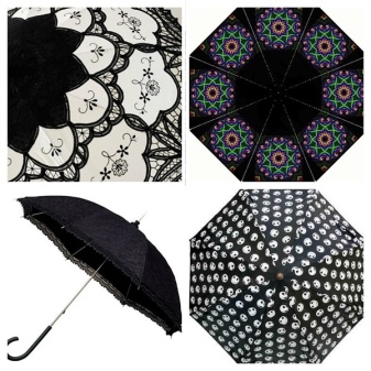 Se vuoi acquistare un accessorio originale e arioso, allora dovresti prestare attenzione agli ombrelli neri alla moda con la stampa sotto la cupola. Tale prodotto enfatizzerà la femminilità dell'immagine e la renderà facile e positiva. Le più popolari sono stampe floreali, immagini di spazio, cielo stellato o mattutino.