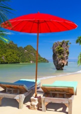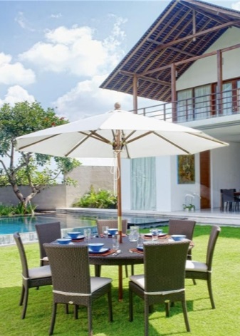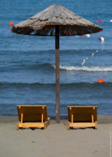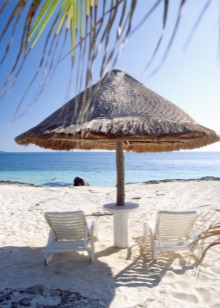 Per gli amanti degli ombrelli esotici creati con materiali non standard - canne, canne e paglia. Tale materiale naturale non ha paura della pioggia e non si sbiadisce al sole. Decorata con tali ombrelloni, la spiaggia darà un sapore insolito al relax e darà una sensazione di felicità ed esotismo.