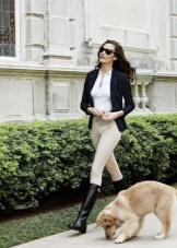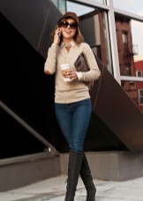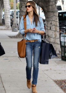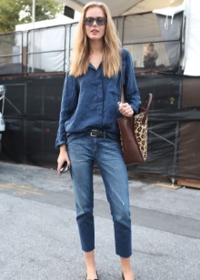 ג'ינס יעזור להעניק לדמות מראה מושקע יותר. עבור צורות בעלות הפה, המקובלות ביותר הן דגמים ישרים כהים עם קו מותניים גבוה.משלימה את המראה עם נעלי ספורט נמוכות, הילדה מאריכה חזותית את הרגליים. בנוסף, אתה יכול ללבוש חולצות רופפות וחולצות טריקו עם ג'ינס, ודגמים עם אלסטי בתחתית יהיו אידיאליים לדמות מלאה.