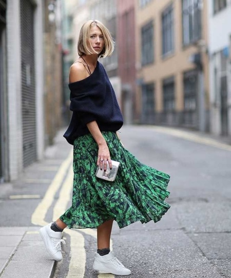 - למסיבת נוער ואפילו דייטים, חצאית כחולה עם קפלים ואורך מיני מותן גבוה בשילוב עם סוודר גדול בגוון ורוד בהיר הוא המתאים ביותר. אביזרים יוסיפו לתלבושת: כובע בייסבול ונעלי עקב בטון לראש וקלאץ 'בסגנון הצבעים של החלק התחתון.