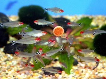 - sausas pašaras aukšta kokybė granulių ar dribsnių pavidalu (geriausiose akvariumininkų apžvalgose naudojami „Tetra“ prekės ženklų produktai, taip pat „Sera“ tropinėms žuvims);