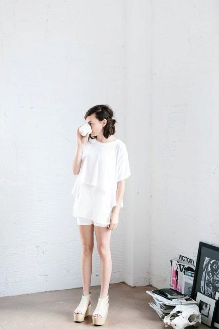 Platformos ir šortų derinys vizualiai padidina kojų ilgį.