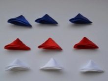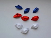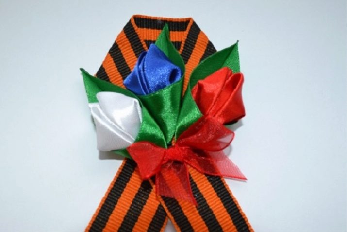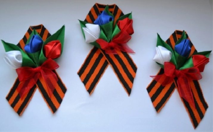 Paimkite trijų spalvų atlasą: baltą, raudoną ir mėlyną. Padaryk trys penkių centimetrų kvadratėliai kiekviena spalva. Po to kiekvieną kvadratą perlenkite per pusę įstrižai ir užlenkite priešingus kraštus, šiek tiek tirpdami, dėka jie sujungs. Pasukdami kiekvieną gabalėlį, gausite žiedlapius, klijuodami juos kartu su termo pistoletu, gausite tris Rusijos vėliavos spalvos gėles.