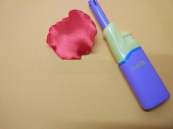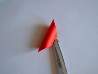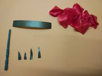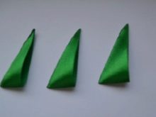 Iš žalio atlaso nupjaukite kelis lapus, jie turės stipriai smailų ir pailgą trikampį. Jų kraštus taip pat reikės išlydyti.