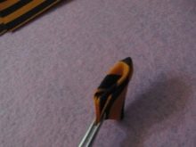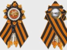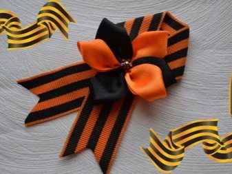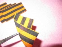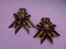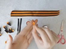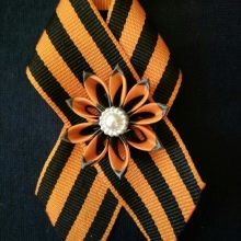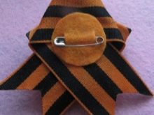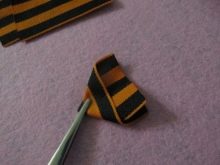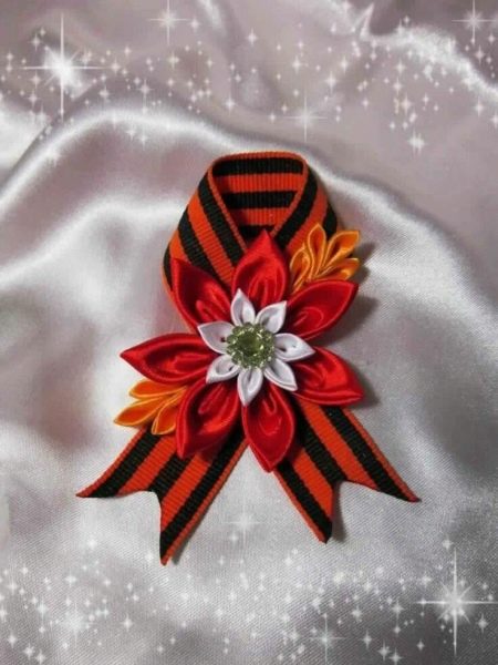 Labai originali aksesuaro versija, aiškiai užsimenanti apie puikius žygdarbius, yra sagė, papuošta kanzashi medaliu. Toks straipsnis pasirodys šiek tiek sudėtingesnis nei aprašytas aukščiau, tačiau viskas pasiteisins, jei griežtai laikysitės instrukcijų. Sunkiausia yra surasti papuošalus, skirtus atlikti paties medalio vaidmenį, tačiau kai kurie meistrai tiesiog atspausdina apdovanojimo atvaizdą ir prideda jį prie glotnus metalinis dangtelis gėrimui. Likusios medžiagos yra pažįstamos: Šv. Jurgio kaspinas ir platūs (4-5 cm) satino juostelės oranžinės ir juodos spalvos.