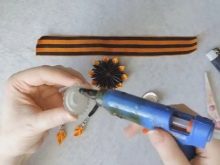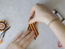 Belieka įstatyti Šv. Jurgio kaspiną į gražų lanką ir tokiu būdu pritvirtinti klijais, arba dar geriau, smeigtukais. Po to suprojektuota gėlė yra klijuota virš juostos.