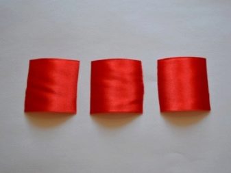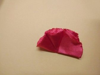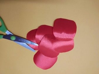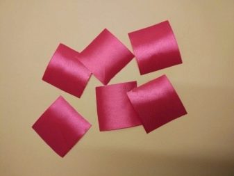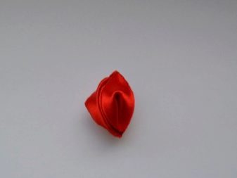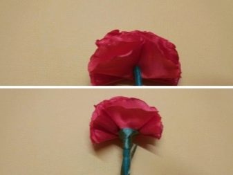 Iškirpti iš raudono atlaso juostelės aštuoni kvadratai su penkių centimetrų kraštu. Kiekvieną kvadratą pasukite į apskritimą, atsargiai apipjaustydami kampus ir kraštus laikydami virš ugnies, kad jie nesukristų. Vykstant šaudymui lengvai traukite ir susiraukšlėkite apskritimus - jie neturėtų atrodyti lygūs, lengva tekstūra jiems netrukdys. Tada sulenkite kiekvieną tokį ratą du kartus per pusę ir gauti aštuonis žiedlapius būsimiems gvazdikams. Iš karto suklijuokite septynis gabalėlius į tvarkingą pumpurą ir aštuntąjį palikite rezerve.