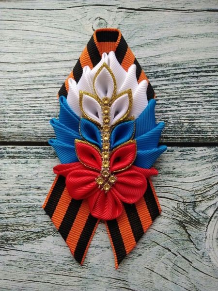 Tai yra dar viena Šv. Jurgio juostelės variacija, tačiau dabar jau sukurta kaip lankas su gražiu kanzashi plaukų segtuku viršuje. Be paties Šv. Jurgio kaspino, verta atskirai atsargų su panašių atspalvių juostelėmis.