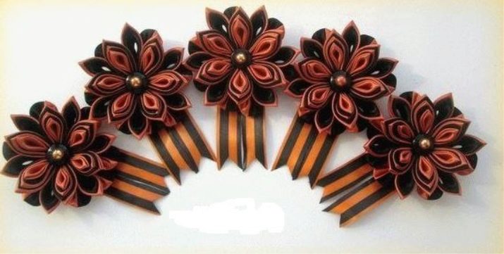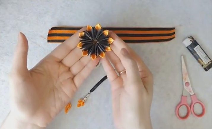 Tada jums tereikia tai patogiai pritvirtinti, nesvarbu, ar tai klijai, ar segtukas - jūsų rankdarbiui ant anksčiau įsigyto šv. Jurgio kaspino. Dėl to baigiama amato gamyba - jūsų kanzashi sagė yra paruošta dėvėti. Ekspertai pabrėžia, kad galite pasirinkti bet kurias kitas pumpurų spalvas ar net padaryti visą puokštę monotonišką - ji vis tiek atrodys gražiai ir stilingai.