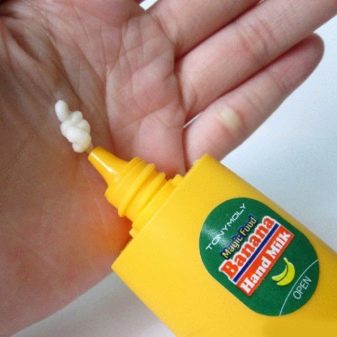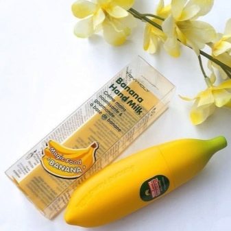 Populiarios rankų pienas su bananų ekstraktu. Produktas supakuotas į banano formos silikono vamzdelį.