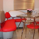 Matmenų atžvilgiu dizainas skiriasi miniatiūriniais matmenimis, tačiau tuo pačiu metu jį galės pritaikyti visi šeimos nariai. Dėl papildomos įrangos kelių išmatų pavidalu, svečius bus galima pastatyti prie vaišių stalo. Atskirai reikėtų pažymėti sėdynės apmušalą. Naudota audinio medžiaga, kasdien prižiūrima, neužsiteršia ir paprastai suteikia virtuvės erdvei sodrią dekoraciją.