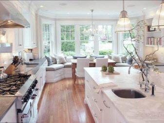 - Didelė įlankos langų įvairovė įsigytas talpinti didelėse virtuvėse. Jie gali būti suapvalintos formos, stačiakampio formos ir net daugialypiai, atsižvelgiant į numatomą interjero dizainą.