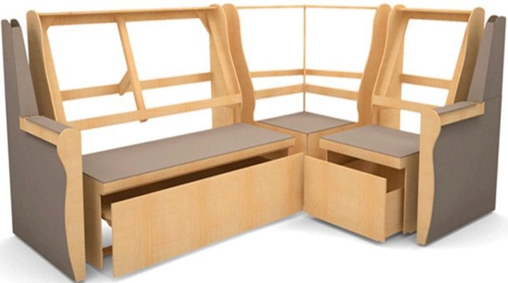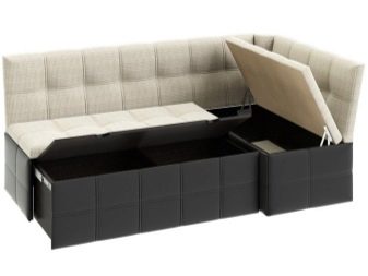 Be to, yra virtuvės sofų, įrengtų su ištraukiamomis lentynomis, dizaino. Tačiau jie turėtų laikyti retai naudojamus daiktus, nes nėra galimybės jais laisvai naudotis.