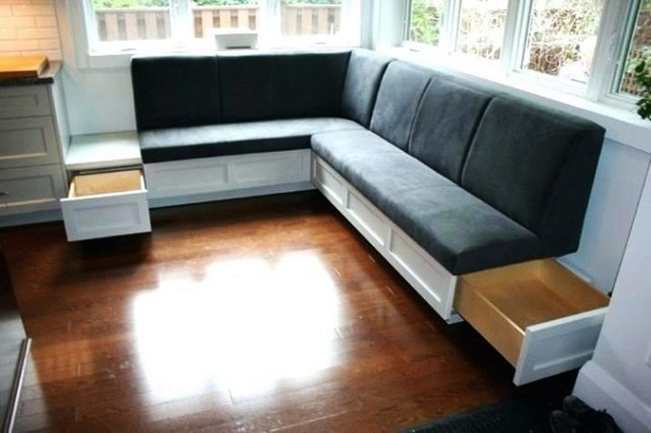 Kampinių virtuvinių sofų su stalčiais, skirtų daiktams laikyti, dizainas atrodo praktiškas.