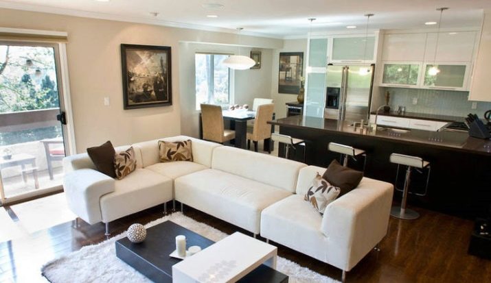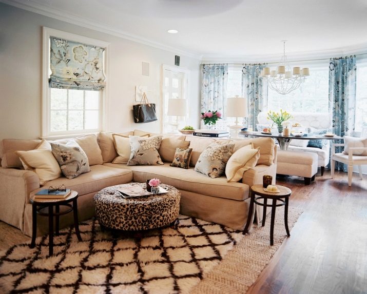 Apskritai kampinės sofos yra skirtingos daugiafunkciškumas. Dideli modeliai turi papildomų lentynų, esančių galinėje pusėje. Tai labai patogu, be to, interjero išvaizda negadina, nes lentynos yra nematomoje zonoje.