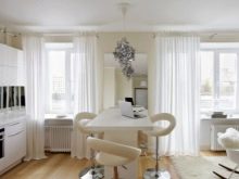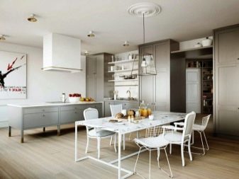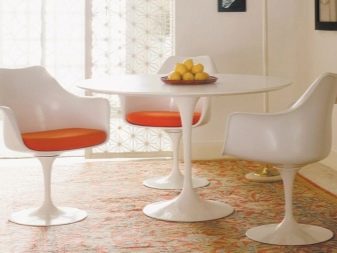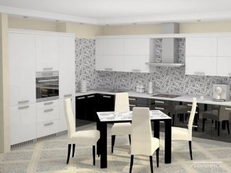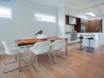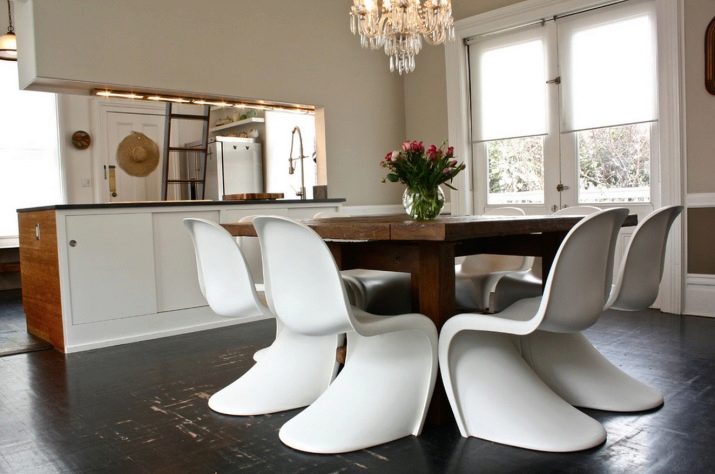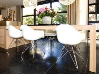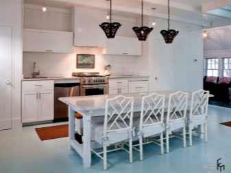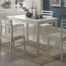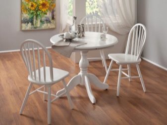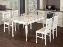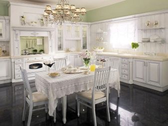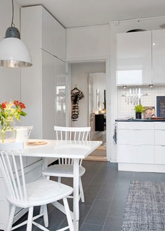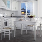 Baltos kėdės labai gerai atrodys kartu su grindimis, padengtomis porceliano akmenimis arba pagamintomis po antikvariniu parketu. Virtuvės kampas atrodo pranašesnis, jei po juo yra kilimas su neįprastu ornamentu.
