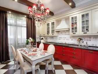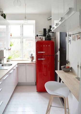 Sukurti virtuvę baltais tonais patiks ne visiems, o tik tiems, kurie vertina aplinkos šviežumą, o tai suteikia galimybę gauti teigiamą įspūdį dėl neįprastų spalvų perpildymų. Jei į nustatymą įtrauksite ryškią liustra, indus, užuolaidas su ryškiomis detalėmis, virtuvė spindės visiškai kitomis spalvomis. Neįprastas dizaino žingsnis - į virtuvės kambarį įdėkite ryškiaspalvių šaldytuvų. Norėdami sujungti su juo, galite naudoti mažas detales ant stalviršio ir ornamentą ant tos pačios spalvos indų.
