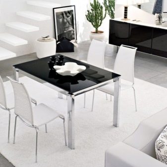Griežtoms formoms išlaikyti naudojamas juodai baltų elementų derinys. Norėdami sukurti pusiausvyrą kambaryje, kėdės su baltu paviršiumi yra derinamos su juodu stalu.Juodos durys ant baltos ausinės atrodys originalios. Šiam deriniui nereikia papildomų akcentų, nes jis yra baigtas. Šis derinys turi šias teigiamas savybes: