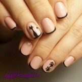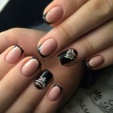 - Labiau paplitęs dizainas yra pagrindinės nagų plokštės padengimas skaidriu laku ir dažymo galiukas juodas. Taigi permatomam lakui taikomas piešinys atrodo labiau kontrastingas ir išsiskiria iš bendro fono.