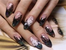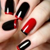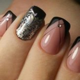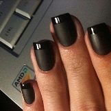 - Pagrindinė nagų plokštelės dalis yra nudažyta juoda spalva, kuri vėliau uždedama ant piešinio. Pats nagų galiukas lakuojamas skirtingu atspalviu (šis tonas gali būti neutralus arba kontrastingas). Ši parinktis vykdoma gana retai.