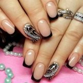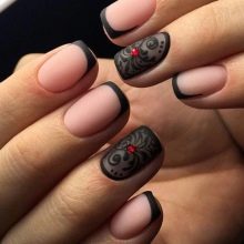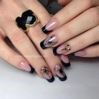 Kita vertus, manikiūro striukė niekada nebus pasenusi, nes profesionalūs nagų priežiūros meistrai nesiliauja sugalvoję naujų būdų, kaip tokį dizainą pagyvinti. Taigi neseniai prancūzų manikiūro stilizavimas - juodi nagai su raštu - įgijo ypatingą populiarumą. Ši parinktis gerai atrodys ant bet kokios formos ir ilgio nagų.