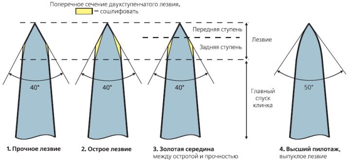 Kampas taip pat turi būti teisingai parinktas. Buitiniai peiliukai, taip pat bet kokie virtuvės reikmenys ištveria 30 laipsnių kampą. Našumas kiekvienam instrumentui skiriasi, tačiau Daugeliu atvejų pakaks 25–30.