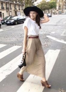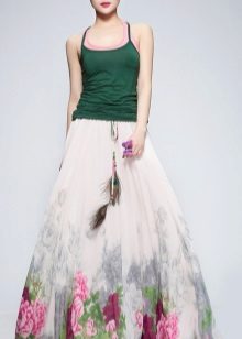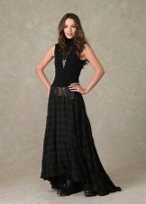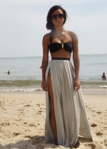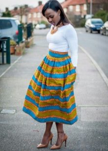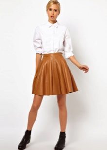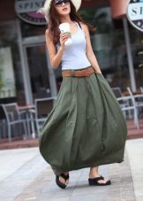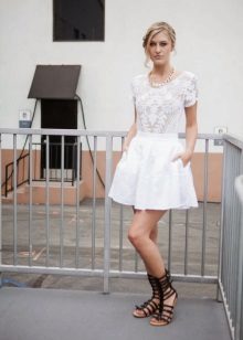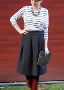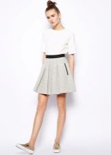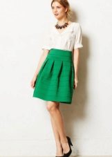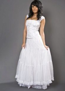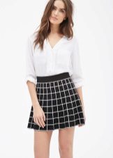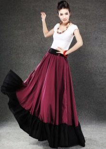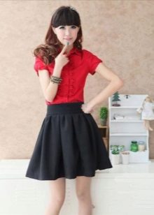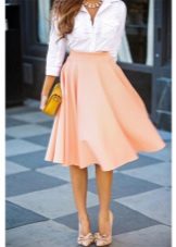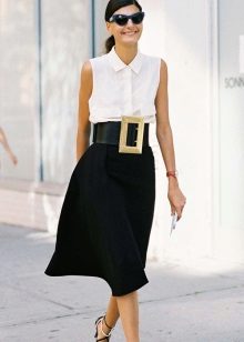 Ilgas baltas kūgio formos sijonas atrodo labai įdomus, jei juo juoda gipurė užtepiama antrasis sluoksnis. Pasirinkę tokiai sijonai tinkamą palaidinę, sukursime lanką šventėms ir verslo susitikimams. Varpo sijonas turi tą patį tikslą. Dėl biuro lanko su juo derinami marškiniai, pritaikytos striukės, o vakare galite dėvėti moteriškesnę palaidinę su elegantiškais dekoro elementais ir portjeromis. Paskutinis etapas - batai ar sandalai su kulnais.