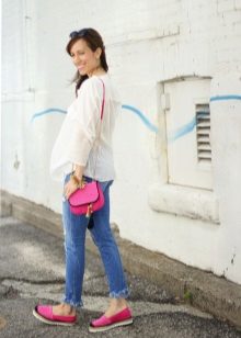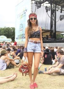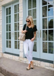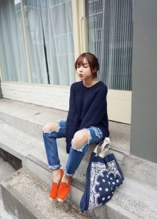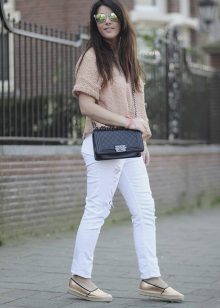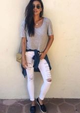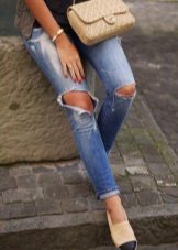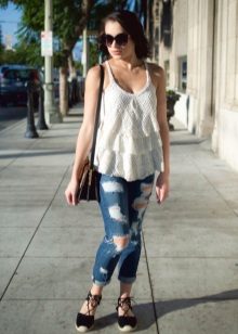Apģērbs, kas piemērots meitenēm ar skaistu, vilinošu figūru. Džinsi - draugi ar saplēstiem ceļgaliem lieliski izskatās ar vieglu virsu, kas izgatavota no smalkas baltas kokvilnas un pakļauj vēderu. Augšdaļu rotā plaša mežģīņu volāna. Baltas, mežģīņotas espadrilas un biezas zoles ir tieši tas, kas jums nepieciešams, lai harmoniski pabeigtu šo apģērbu.
