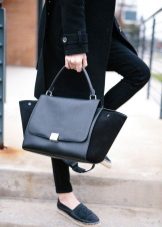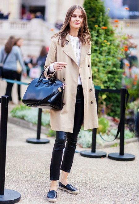 Tendences melnās ādas espadrilas nemanāmi saplūdīs ar melniem ādas stulpiņiem, baltu džemperi un smilšainu tranšejas mēteli. Šādu vienkāršu, bet neticami stilīgu kompozīciju papildina liela melna soma, kas ir ne tikai dekoratīvs elements, bet arī diezgan funkcionāla lieta.