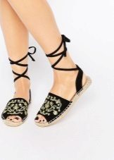 Espadrilas, kas izšūtas ar fliteriem, izskatās diezgan eleganti, tāpēc tās var būt piemērotas pat vakara izskata radīšanai, ja, protams, vēlaties to padarīt nestandarta. Tīri spīdīgas "čības" var kļūt par cienīgu aizstājēju pat visgreznākajiem papēžiem.