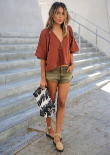 Gaišs vasaras izskats izsmalcināta sievišķīgā stila labākajās tradīcijās. Gaišu kreklu gaišā citrona nokrāsā lieliski papildina smilškrāsas kokvilnas šorti. Khaki soma un haki auduma espadrilles ir tas, kas jums nepieciešams, lai pabeigtu šo kombināciju.