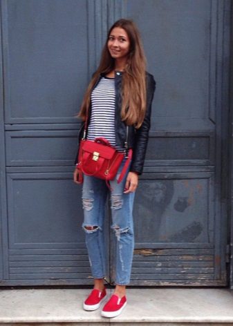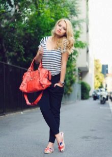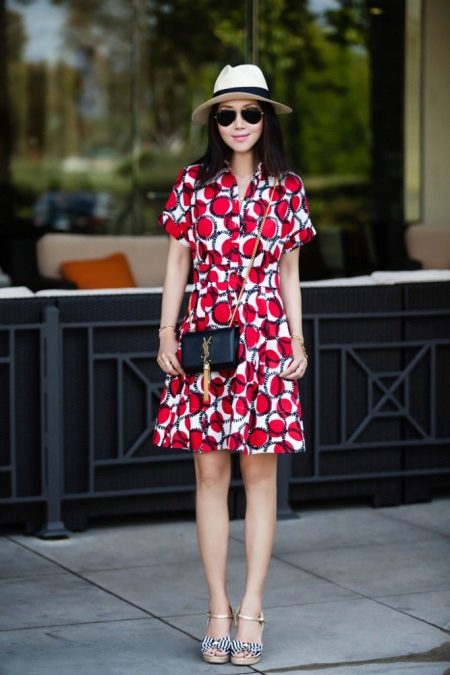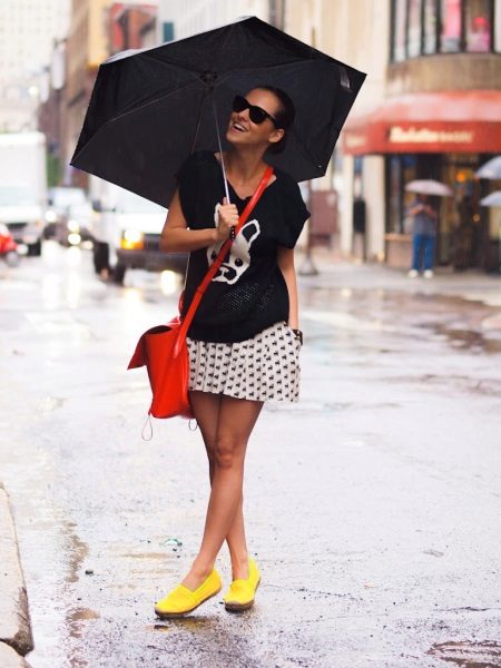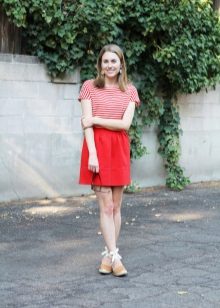 Kompetenti izmantojot spilgtas detaļas, tās kļūs par neaizstājamu apģērba rotājumu. Piemēram, spilgti dzeltenas espadrilas lieliski papildinās baltas kroku drukas svārkus un stilīgu adītu blūzi bez piedurknēm. Bet apavi nav šī attēla galvenā uzmanība, jo visa uzmanība tiek koncentrēta uz milzīgo sarkano maisiņu uz pleca siksnas.