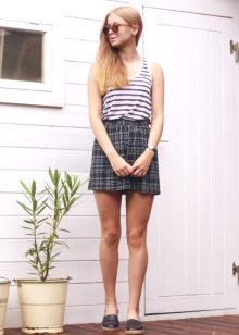 Ne vienas meitenes drēbju skapis var iztikt bez stilīgiem mini svārkiem, šajā gadījumā tas ir dziļi zilā nokrāsains modelis, kas dekorēts ar auduma “ziedlapiņām”. Ažūra balta virspuse un gaiši rozā jaka lieliski papildina šos svārkus, un auduma espadrilas ar zilām un baltām svītrām kļūs par apģērba izcelto elementu.