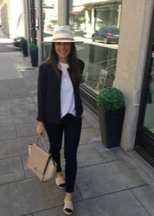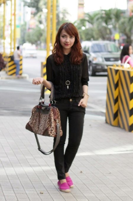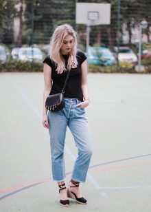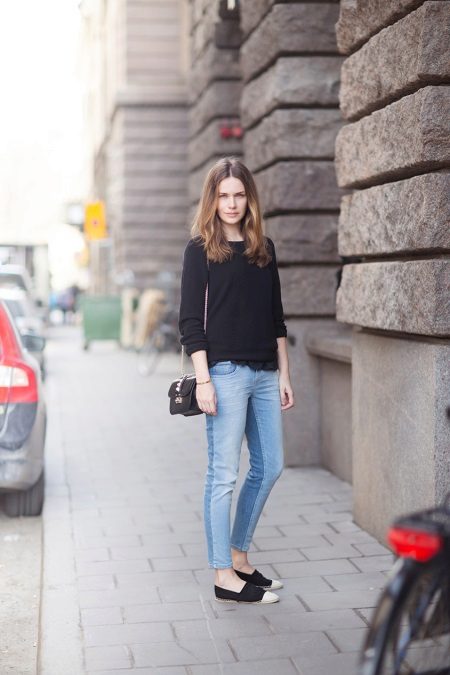 Gaiši zili džinsi, cieši pieguļoši modeļi, apvienojumā ar melnu džemperi un melnām espadrilles ar baltu zeķi izskatās ļoti stilīgi un vienlaikus atturīgi. Neliela rokassomiņa uz ķēdes lieliski papildina apģērbu.