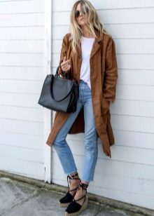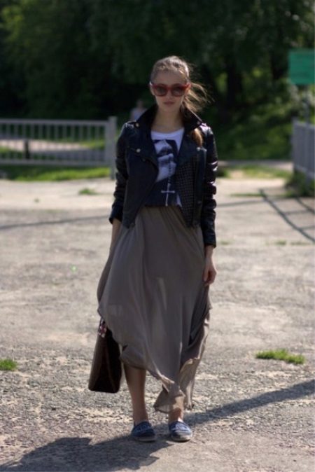 Gariem, kalikona kapučīno krāsas svārkiem ir brīvs raksturs, un tie labi derēs ar baltu apgrieztu t-kreklu un ādas jaku - ādas jaku. Šādam interesantam, nestandarta attēlam ir nepieciešams tāds pats nestandarta papildinājums, un džinsa espadrilas ir lieliski piemērotas.