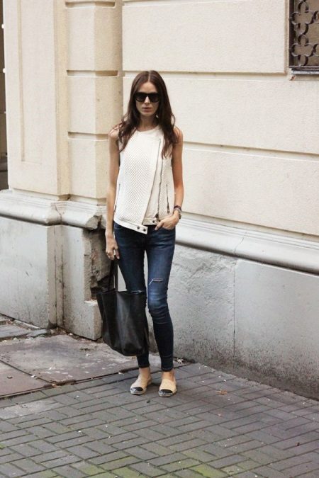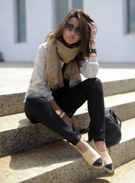 Turklāt espadrilas lieliski izskatīsies ar dvīņu komplektiem, kas sastāv no žaketes un vestes, ar krekliem, puloveriem un džemperiem.