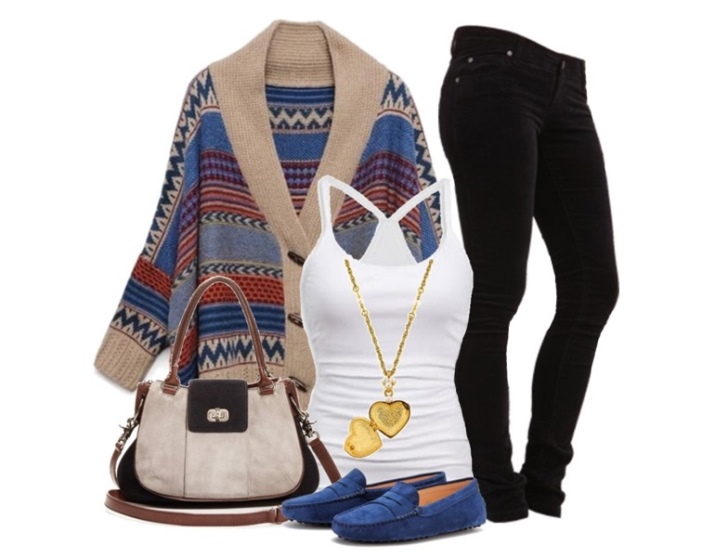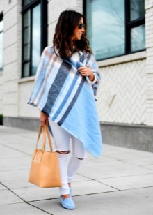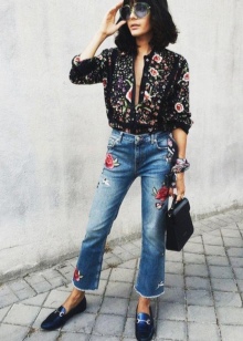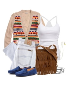 - Mājīgs attēls etniskā stilā ir lieliski piemērots pastaigām pa pilsētu vai ceļošanai. Mēs apvienojam melnus džinsus ar baltu T-kreklu ar aksesuāriem, ziliem mokasīniem un jaku ar pārsteidzošu etnisko rotājumu. Ir svarīgi, lai jaka būtu krāsa, kas atbilst apavu krāsai.