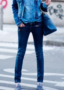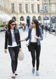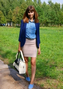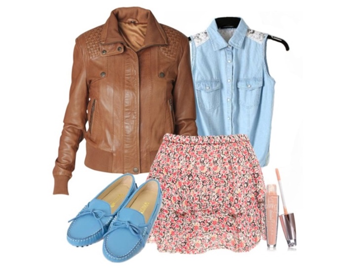 - Romantiskais variants var izskatīties neķītrs: īsus krāsainus svārkus ar džinsa augšdaļu un tāda paša nokrāsa mokasīnus papildina brūna ādas jaka un diskrēts grims. Šis komplekts izskatās dabiski un rotaļīgi.