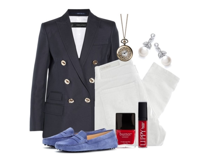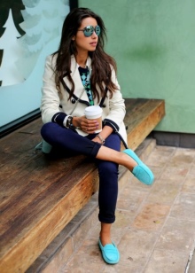 - Žanra klasika ir valkāt zilus mokasīnus ar baltu apģērbu, kas atgādina jūras stilu. Piemēram, pievienojiet baltas bikses ar flotes militāro jaku ar pogām un spilgtu lūpu krāsu. Varat arī pievienot veste. Iegūstiet stilīgu un ļoti ērtu loku.