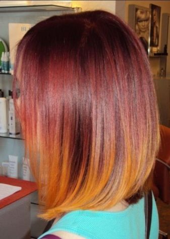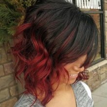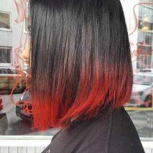 Atsevišķa uzmanība ir pelnījusi piesātinātas sarkanās krāsas ombre, kas patiešām izskatīsies iespaidīgi tumšo šķipsnu īpašniekiem. Augšpusē saknēm ir dziļa tumša nokrāsa, kas pārvēršas par koši vai sarkanu. Līdzīgas frizūras veidošanas procesā, tāpat kā multitonāla un divu toņu ombre gadījumā, krāsainās daļas tiek iepriekš noskaidrotas.