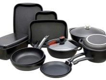 - Universālums. Uzņēmuma pannas var izmantot visu veidu gāzes un elektriskajām sildīšanas ierīcēm, izņemot indukcijas modeļus. Izņēmums ir lietie trauki. Tas nav piemērots ēdiena gatavošanai uz stikla keramikas ierīcēm. Bet, ja trauku rokturi tiek noņemti, to var izmantot cepeškrāsnī. Tas pats attiecas uz modeļiem ar tērauda vai alumīnija rokturiem.