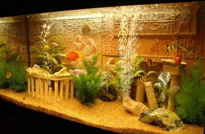 Perlu diingat bahawa kehadiran elemen hiasan sedemikian di dalam air tidak menjejaskan kesihatan ikan. Sebaliknya, sesetengah spesies menggunakan objek hiasan dalam bentuk tempat perlindungan untuk gorengnya. Walau bagaimanapun, apabila mereka merancang arah plot perlu mengambil kira nisbah saiz pemandangan bawah air dengan saiz tumbuhan dan penduduk takungan tersebut.