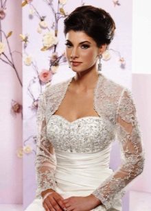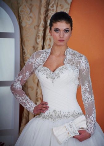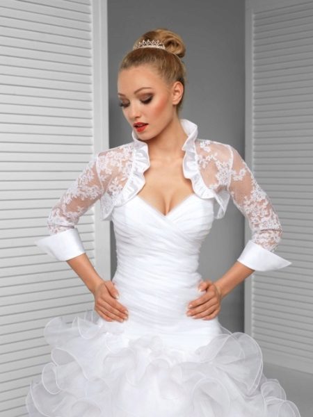 Model yang paling cantik dan feminin adalah boleros perkahwinan.Bolero sedemikian boleh dibuat sepenuhnya dari renda putih terbaik atau digabungkan dengan bahan lain, seperti tulle.
