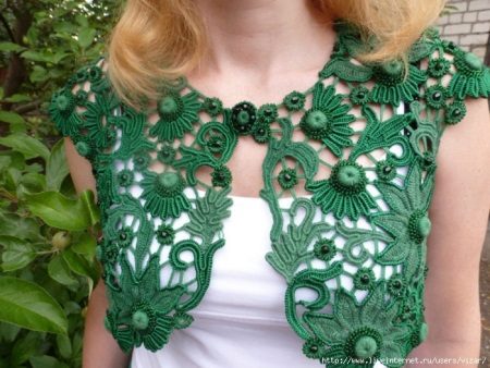 Renda Ireland. Teknik mengait yang sangat popular pada tahun-tahun kebelakangan ini, dengan mana anda boleh membuat corak renda yang benar-benar unik dan eksklusif. Pertama, motif individu dikait, paling kerap, ini adalah perhiasan bunga, maka mereka dihubungkan dengan bantuan grid ke kanvas keseluruhan.