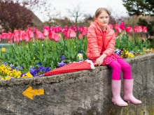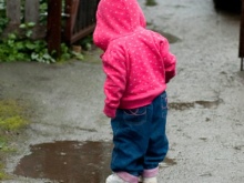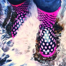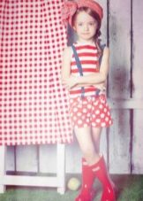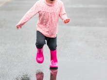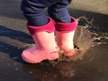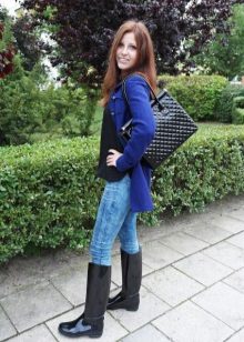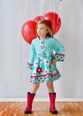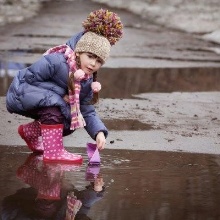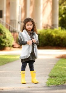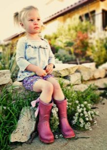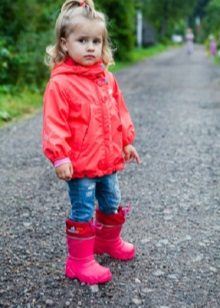 Pakai kasut getah dan jangan menampar di lopak? Ia tidak berlaku! Butang merah jambu bergaya kelihatan hebat dengan jaket biru, topi rajutan dengan pompom yang enak dan selendang yang dikait untuk memadankan but.