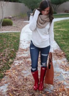 Siapa kata bahawa kasut getah tidak sesuai dengan pakaian? But kelabu rendah kelihatan hebat dengan pakaian tanpa lengan hitam yang indah. Syal coklat yang bergaya melengkapkan rupa yang bergaya.