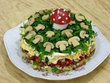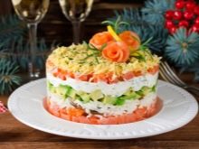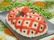- Puff salad boleh diberikan pelbagai bentuk: bentuk geometrik, haiwan, tumbuh-tumbuhan. Untuk kemudahan, anda boleh menggunakan hidangan khas atau peranti mudah alih lain (sebagai contoh, kotak plastik kerinting dari kek).