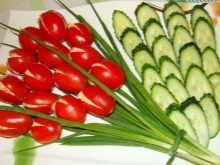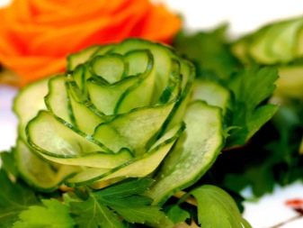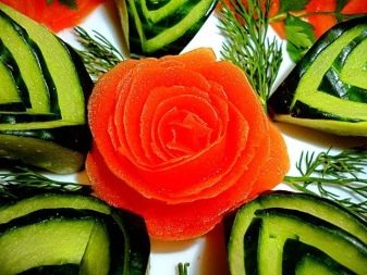 Salah satu cara yang paling popular untuk menghiasi hidangan adalah untuk menghiasi dengan bunga yang dilipat dari kepingan sayuran. Pisau dengan pisau sempit perlu memotong sayur-sayuran ke dalam plat nipis.Teras bunga terbentuk dari satu pinggir diameter kecil yang dipintal ke dalam tiub. Dari baki sayuran yang dihiris nipis, anda perlu membuat kelopak.