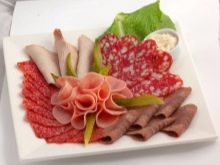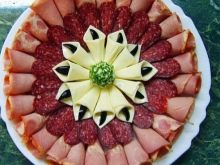 Untuk membuat potongan daging yang cantik, semua produk perlu dipotong menjadi kepingan nipis. Potong hampir telus sosis dan babi rebus akan cukup untuk menyebar dengan indah di atas piring dalam bentuk tiub, bunga atau cara lain.